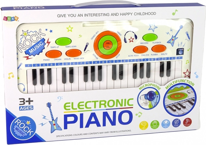 Klaviaturet har indgange på bagsiden af kabinettet. Det kan drives af 4 x AA 1,5 V batterier, som ikke medfølger. Instrumentet har CE-sikkerhedscertifikat og er egnet til alle børn over 3 år. Det leveres i original æske og er derfor ideelt som gave.