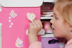 Indeni finder du en bøjlestang til bøjler, praktiske hylder og skuffer til småting. På ydersiden er der skyformede kroge til tasker og andet tilbehør samt et stort spejl til det perfekte outfit. De medfølgende klistermærker gør det muligt at finjustere udseendet helt efter barnets fantasi.