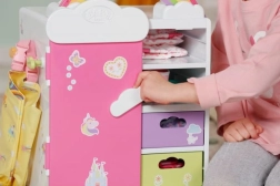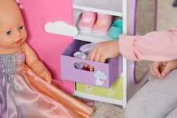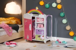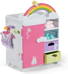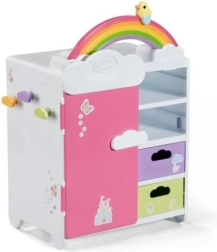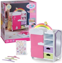 Et stilfuldt garderobeskab til BABY born-dukker forvandler omklædning til en magisk leg. Den farverige regnbue med lys, glade melodier og praktiske opbevaringsløsninger med bøjlestang, hylder og skuffer sikrer både orden og sjov. Udvendigt er der søde kroge formet som skyer, og indeni et stort spejl til at finpudse outfittet. Der medfølger også et ark klistermærker til kreativ personliggørelse.