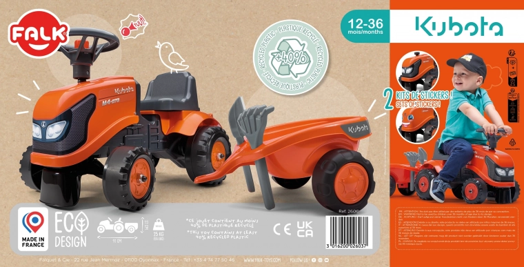 Fremstillet i Frankrig af holdbare materialer; licenseret KUBOTA-design og kvalitet fra Falk giver sikker underholdning for de mindste.