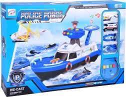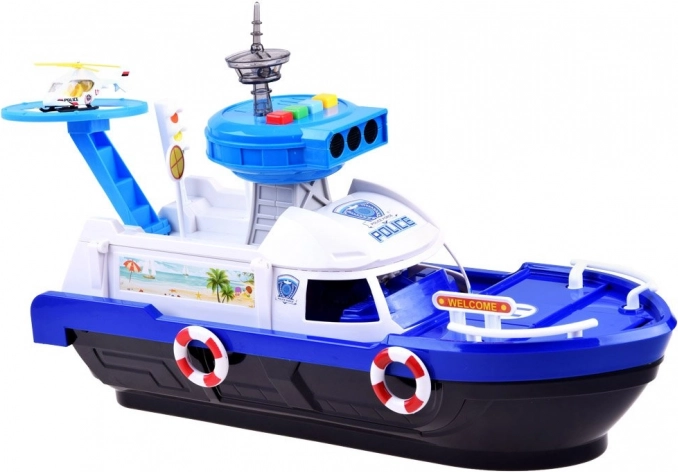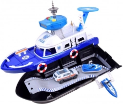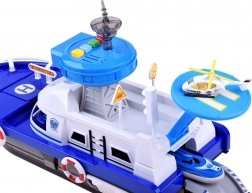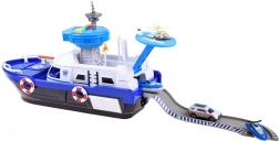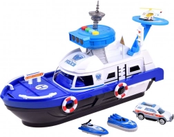 Dette detaljerede politiskib i hvid-blå farvekombination er klar til enhver mission – på vandet, på land og i luften. Ombord finder du en helipad med helikopter, et kontroltårn med lys- og lydeffekter og indvendig opbevaringsplads til transport af køretøjer. Det åbne cockpit med rat og kaptajnfiguren øger realismen i legen.