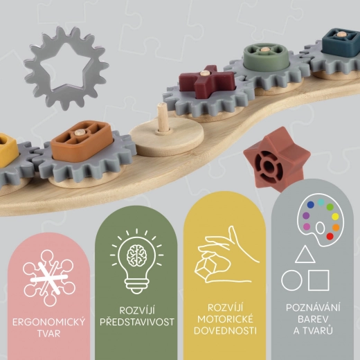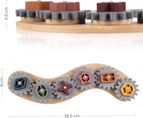Oplev læringens magi med vores bambus-silikone puslespil, der forener leg og viden. De farvede tandhjul udvikler dit barns finmotorik, logiske tænkning og fantasi. Kombinationen af naturlig bambus og sikker silikone giver en behagelig sanseoplevelse og understøtter en naturlig udforskning af mekanikkens verden.