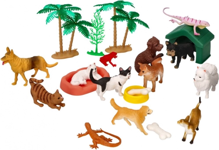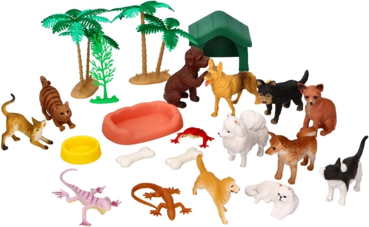 Med dette sæt får du et bredt udvalg af husdyrfigurer og deres tilbehør, såsom hundehuse, vandskåle og knogler.