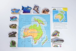 Dyk ned i den fascinerende verden af australsk fauna med et træpuslespil, der indeholder 16 kortbrikker og 10 fritstående dyr. Puslespillet er lavet af kvalitets-MDF, hvilket sikrer lang holdbarhed og sikkerhed for børn. Dyrene er realistisk afbildet, hvilket styrker fantasien og den visuelle forståelse.