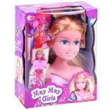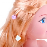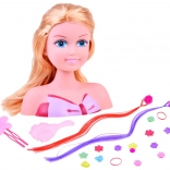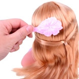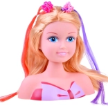 Elegant frisørdukke med skinnende blonde lokker og tilbehør til at skabe frisurer vil sandsynligvis appellere til enhver lille frisør. Modellen har lange blonde lokker, hendes styling suppleres af to farverige striber i lilla og rød.