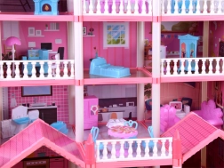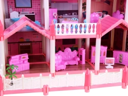 Denne charmerende lyserøde villa giver børn masser af plads til fantasi: 10 detaljerede rum, altaner og terrasse, der indbyder til leg med hjem, hotel eller pensionat. Konstruktionselementer og møbler er lavet af robust plast, mens vægge, gulve og tage er af karton med farvet tryk af rummene – når huset er samlet, virker det meget æstetisk og hyggeligt.