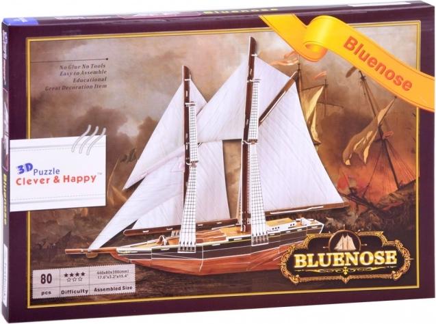 Denne detaljerede 3D-model af den berømte canadiske skonnert BLUENOSE fra Nova Scotia vil glæde både skibs-, historie- og puslespilsentusiaster. Takket være gennemtænkte dele får du en flydende byggeoplevelse, og resultatet er en imponerende replika med sejl og rig, klar til udstilling.