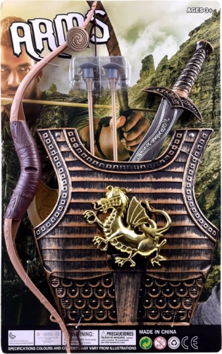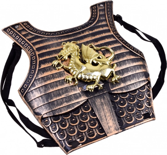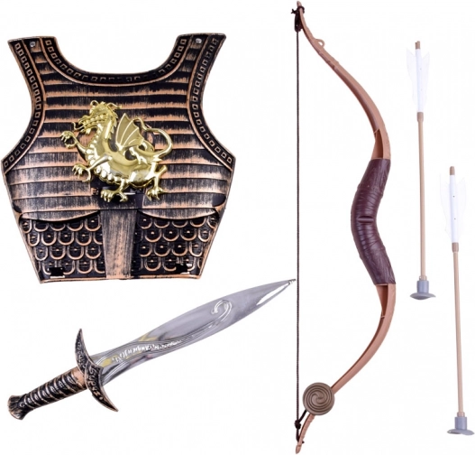 Dette komplette ridderudstyr er perfekt til hjemmeeventyr, fastelavn og børnefødselsdage. Rustningen med en markant gylden drage sidder godt takket være justerbare stropper, buen med to sikre pile med sugekop glæder små skytter, og det lette sværd fuldender enhver heltefærd.