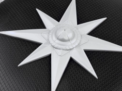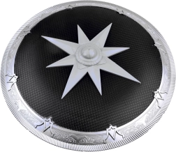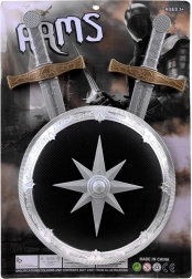 Det runde skjold med stjernemotiv og sværdet med dekorativt gyldent greb virker realistiske og giver ethvert kostume et imponerende udtryk.