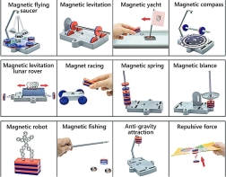 Pakken indeholder farvede magneter, plastbaser og tilbehør, som kan bruges til temaprojekter – for eksempel et pendul-UFO, et magnetisk køretøj eller en figur af metalmøtrikker. Takket være de overskuelige dele er samlingen nem og sikker, ideel til hjemmeundervisning og skoleklubber.
