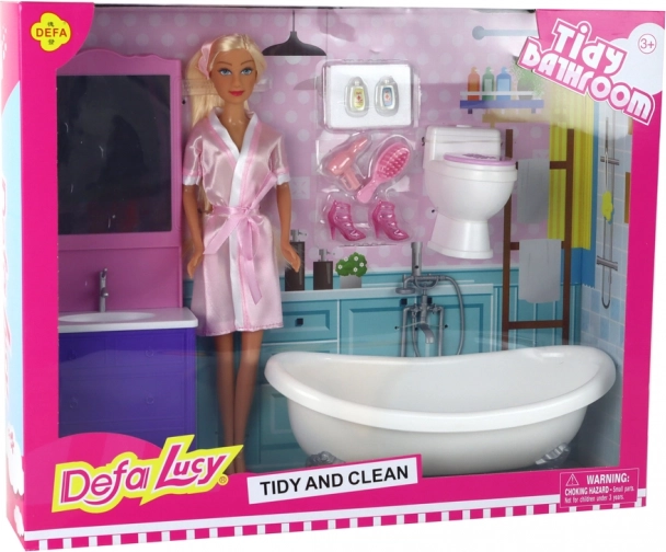 Sættet indeholder et hvidt fritstående badekar, et toilet med lyserødt låg og en vask med spejl samt uundværligt tilbehør: håndklæde, børste, hårtørrer og et par ekstra lyserøde pumps med hæl. Alt er designet til at understøtte imaginativ leg, udvikling af empati og historiefortælling.