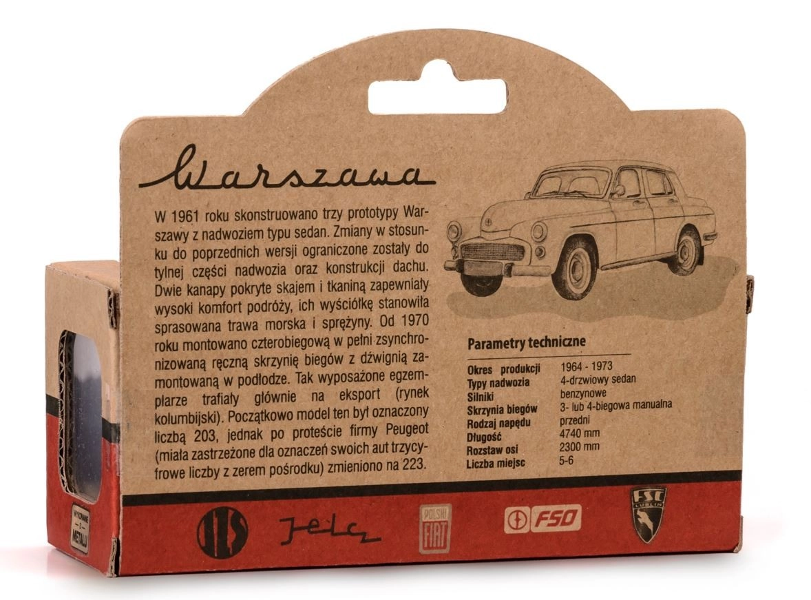 Warszawa 223 er en model af den kendte polske bil, der blev designet i 1961 med en sedan-karosseri. Elegant design og omhyggeligt udarbejdede detaljer gør den til et ideelt supplement til enhver bilmodel-samling. De væsentligste egenskaber ved denne model inkluderer: