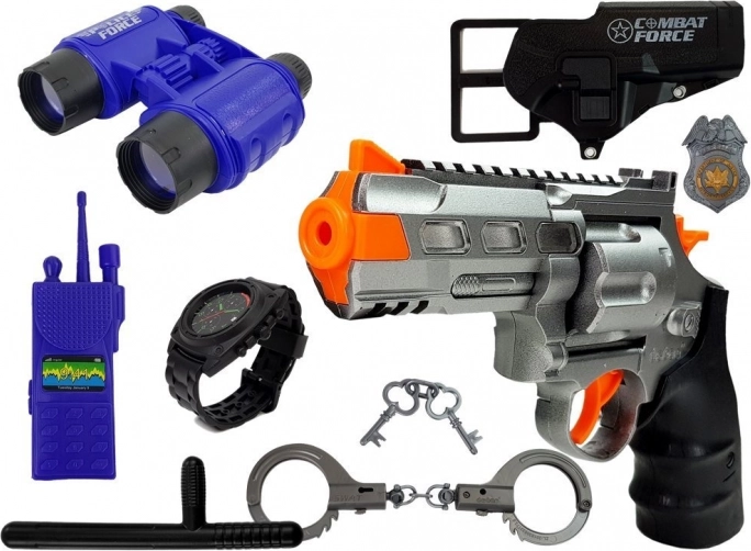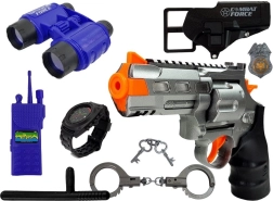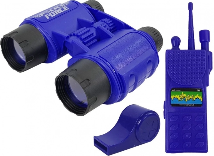 Håndjern med nøgler, badge, walkie-talkie, fløjte og kikkert – alt hvad en lille betjent behøver til en spændende mission.