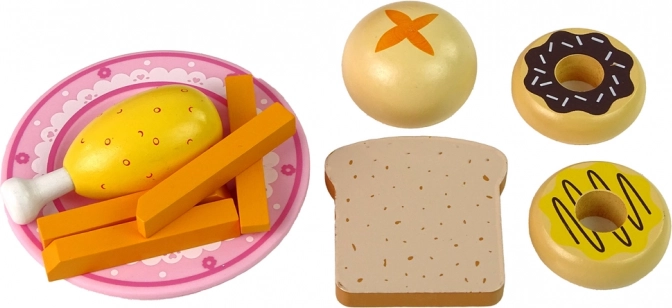 Inkluderer tallerken og et udvalg af mad: donuts, brød, pommes frites og kyllingelår – ideelt til servering og rolleleg som kok.
