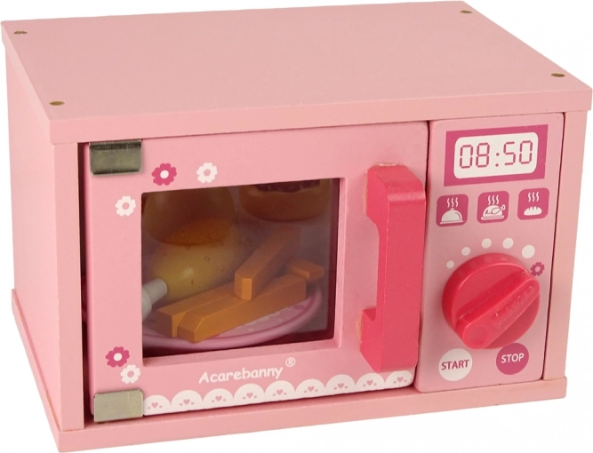 Den søde lyserøde træmikroovn til børn er et fantastisk supplement til lege-køkkenet. Den har dør med magnetlukning, et drejehjul med kliklyd og leveres med et rigt sæt træmad til realistisk madleg. Fremstillet af kvalitets- og sikkerhedstestet træ med holdbare farver.