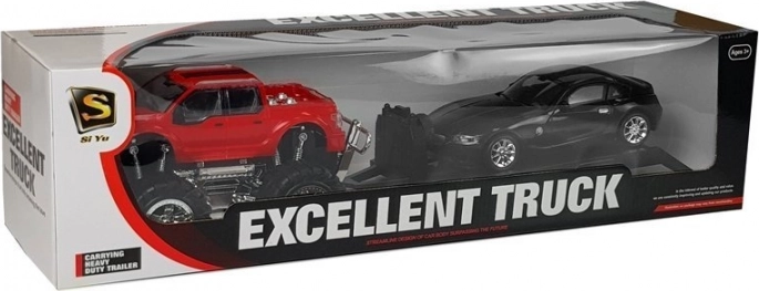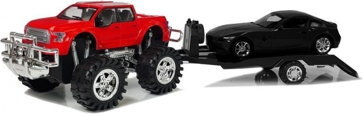 Sæt af køretøjer rød monstertruck med trailer og sort BMW 58 cm