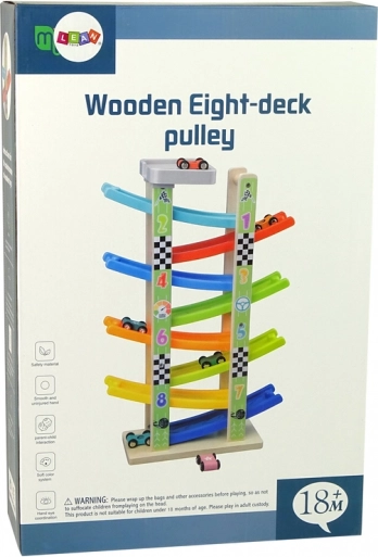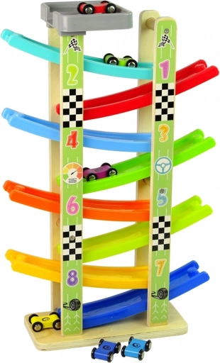 Denne farverige træ nedkørselsbane fanger enhver lille barns opmærksomhed. Hver af de 8 etager er markeret med et tal, så børn på en legende måde styrker tællefærdigheder og farvegenkendelse. Barnet placerer en bil på den øverste platform og ser, hvordan den hurtigt roterer og kører ned ad de skrå planer. Underholdning, der fremmer logisk tænkning og visuel perception.