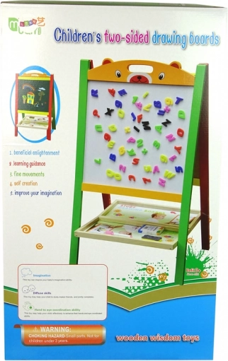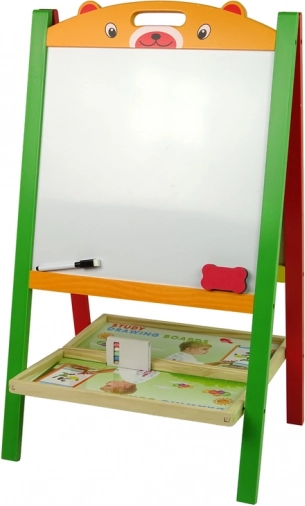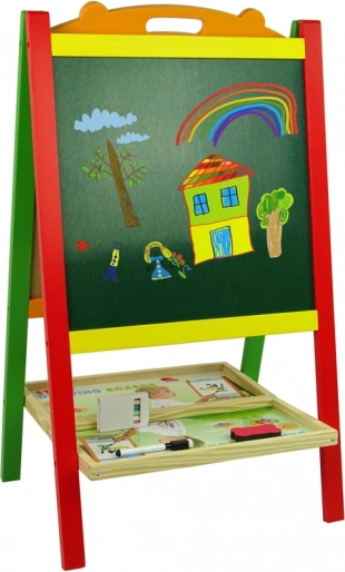 Denne dobbeltsidede træ-tavle 2-i-1 støtter børn i kreativ udfoldelse og tidlig læring. På den hvide side kan de skrive og tegne med aftørlig whiteboard-tusch, den grønne magnetiske flade er ideel til at danne ord af bogstaver og øve regning med tal og symboler. Den stabile ramme og den praktiske hylde/skuffe holder alt lige ved hånden.