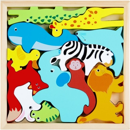 Dette farverige træpuslespil giver børn glæden ved at udforske dyrenes verden. Opgaven er at placere de enkelte dyrebrikker korrekt på pladen – hver brik har en anden form, så børnene øver formgenkendelse og tålmodighed. Sættet indeholder 12 dyr, for eksempel en løve, en zebra, en abe og en spækhugger.