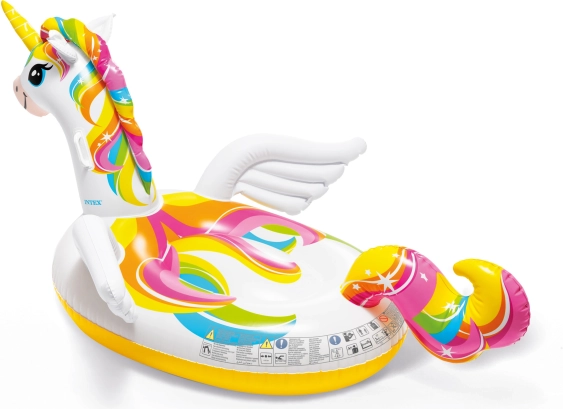 Stilfuld oppustelig enhjørninge-ø fra INTEX: 251 × 163 × 145 cm, 2 kamre, 2 håndtag, bæreevne 200 kg, holdbar vinyl og reparationslap. Ideel til sommeren.