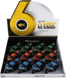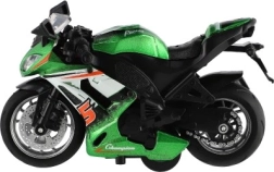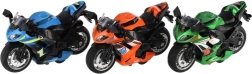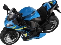 Denne racermotorcykel er designet til børn fra 3 år og tilbyder realistiske detaljer i tre forskellige farver. Den måler 12 x 7 x 6 cm og er lavet af en kombination af metal og plastik.