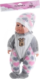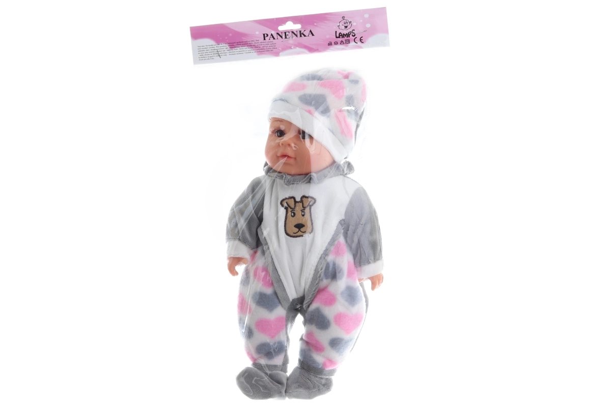 Baby med blød krop. Når man trykker på kroppen, begynder babyen at lave lyde (latter, gråd, mama, papa). Babyen er klædt i farverig pyjamas, som kan tages af (velcro). Babyens mål ca. 30 x 15 x 6 cm. Pakket i plastpose. Drives af 3 knapcellebatterier. Alder 3+.