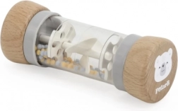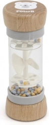 En gennemsigtig rangle med perler afgiver blide, beroligende lyde og indbyder til udforskning. Barnet træner hørelsen, visuel sporing og hånd-øje-koordination ved at ryste, dreje og flytte den mellem hænderne.