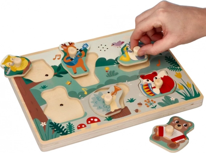 Dette træ-lydpuslespil med skovtema giver børn deres første møde med musikinstrumenter på en legende måde. Hver farvet brik med et dyr har et praktisk greb for let håndtering, og når den placeres korrekt, afspilles den tilsvarende lyd, som motiverer til gentagen leg og udforskning.