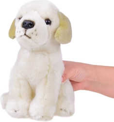 Den søde plyshund labrador vil glæde enhver dyreelsker. Den har et realistisk udseende, er lavet af blødt og behageligt materiale i beige farve og er sikker for børn – ideel som kælen legetøj og en nuttet sovekammerat.