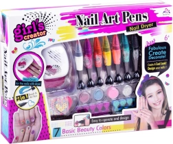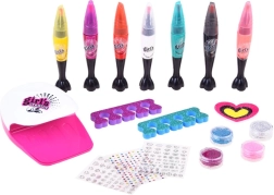 Kreativt manikure- og pedikuresæt til børn bringer alt, hvad der behøves til original negledekorering: 7 farvede penne/lakker med præcis spids og pensel, glitter, klistermærker, tåseparatorer og en praktisk mini tørreapparat på batteri. Perfekt sjov til hjemligt SPA og hygge med veninder.