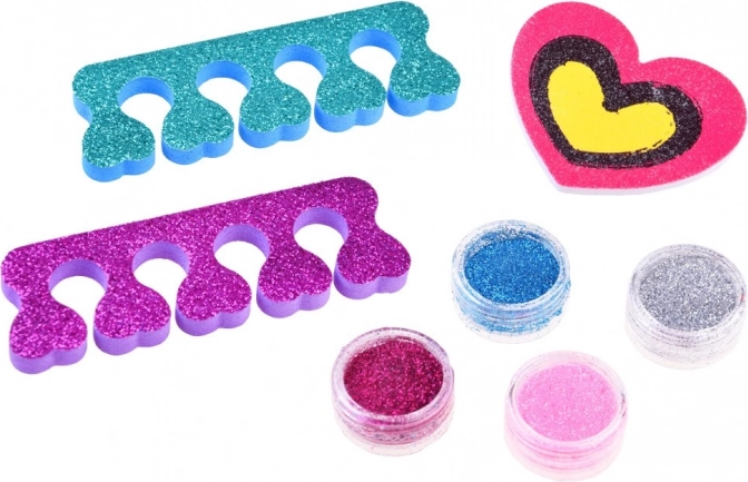 Fire farver glitter og klistermærker til effektfuld dekoration suppleres af bløde tåseparatorer – lakering af tånegle bliver behagelig og præcis.
