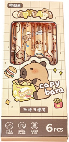 Capybara-pensættet er et fremragende valg for alle, der elsker disse nuttede dyr, og for enhver, der sætter pris på stilfuldt kontortilbehør. Sættet indeholder 6 farverige penne, som skriver med en markant blå farve og sikrer glat og behagelig skrivning på forskellige overflader.