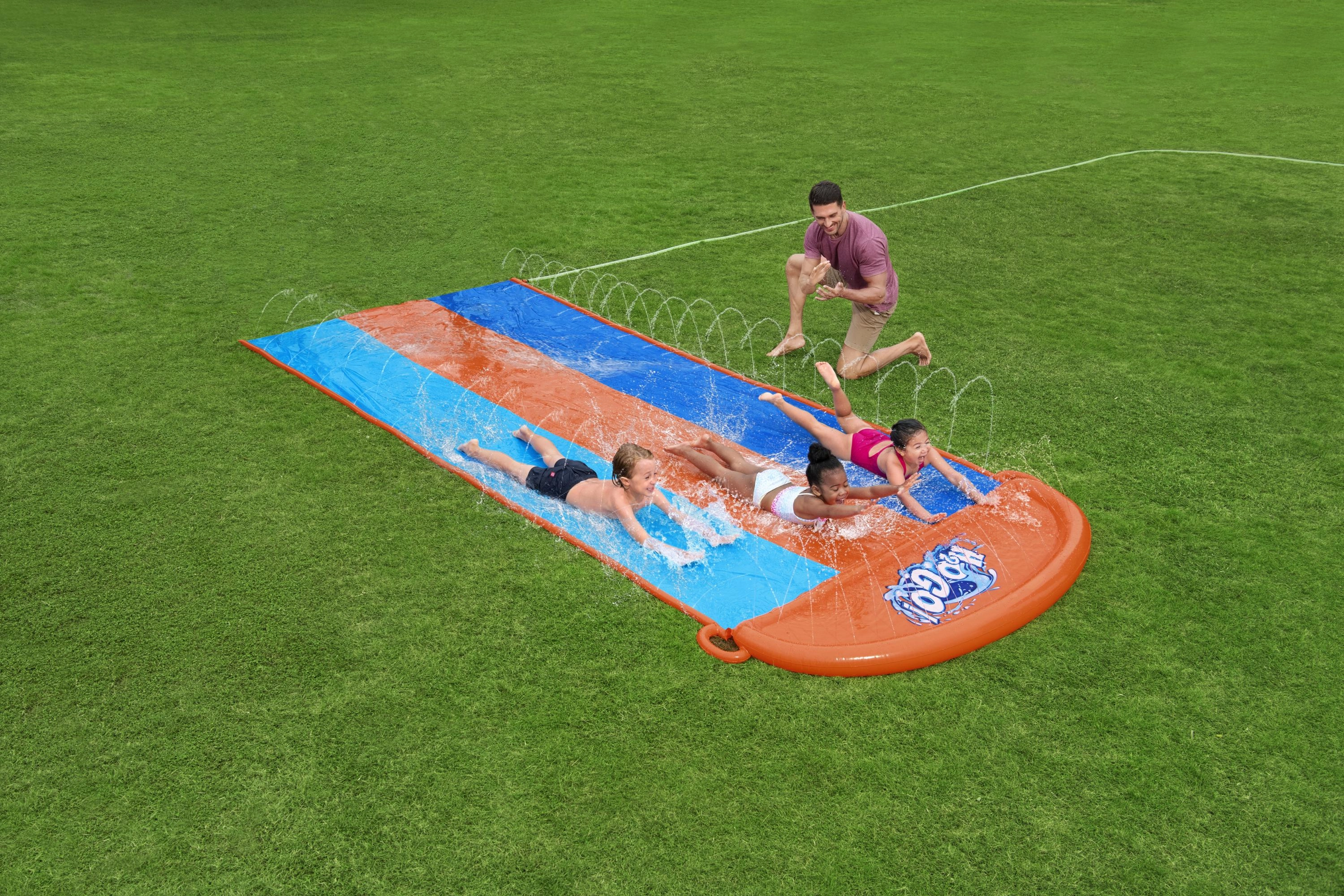 Arrangér hjemmebane-vandløb direkte i haven. Den tredobbelte BESTWAY-sklie tilbyder tre parallelle spor, så børn kan konkurrere side om side. Sidebrusere skaber en blid vandkaskade og holder overfladen perfekt våd for en hurtig og jævn glideoplevelse.