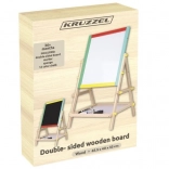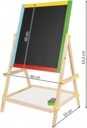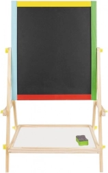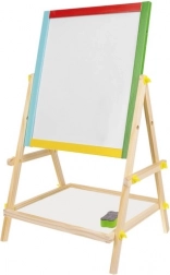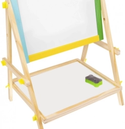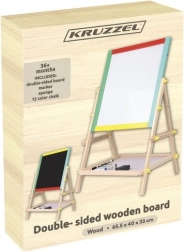 Kreativ og sikker dobbeltsidet 2-i-1 tavle til små kunstnere – på den ene side kridttavle, på den anden tør-sletbar og magnetisk. Takket være den roterende mekanisme, den robuste trækonstruktion og hylden til tilbehør understøtter den fantasi, læring og finmotorik. I pakken er alt til øjeblikkelig sjov: kridt, tusch og svamp.
