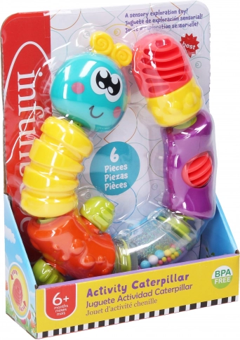Denne farverige, sammenklappelige kålormsrangle er det ideelle første legetøj til nysgerrige små hænder. Delene er lette at koble sammen og skille ad, de laver en behagelig raslelyd og motiverer børn til at udforske, gribe og bygge. Legetøjet er designet til sikker brug allerede fra 6 måneder.