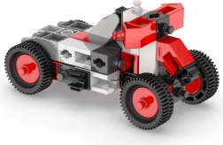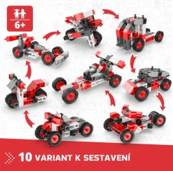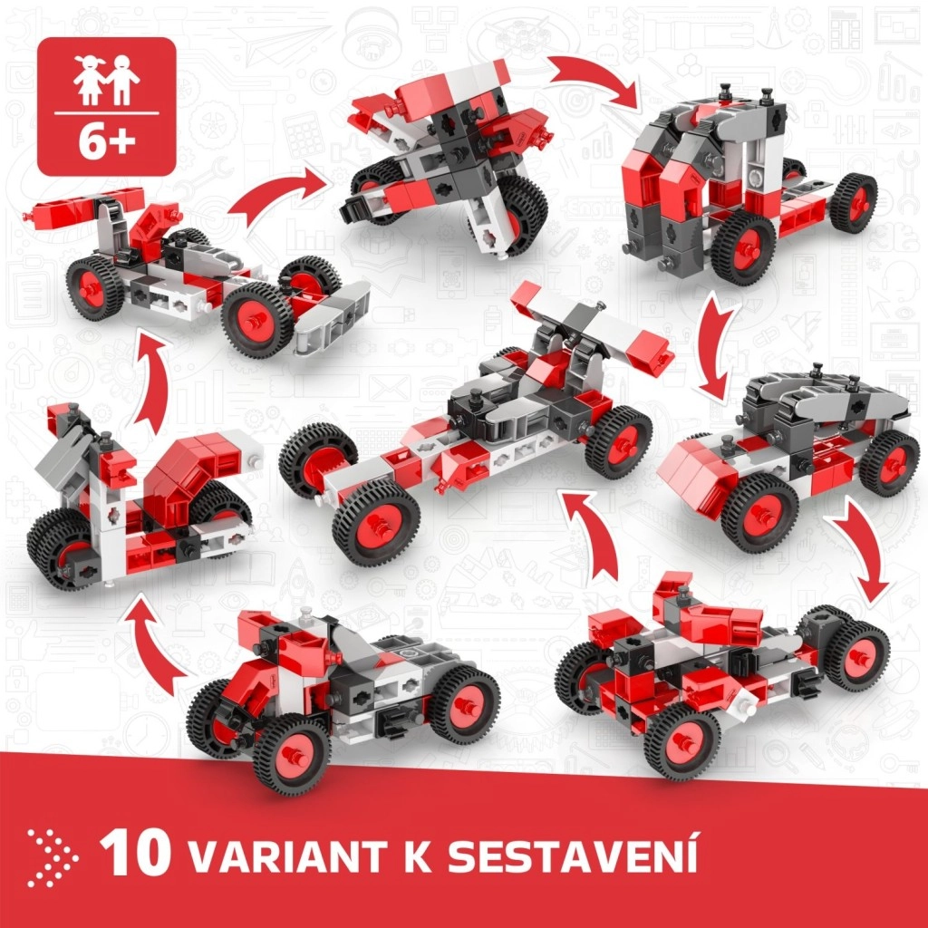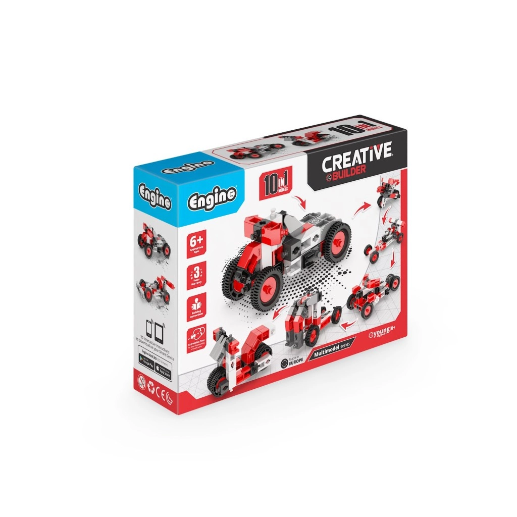 Dette ENGino Creative Builder-sæt bringer børn ind i en verden af teknik og fantasi i ét. Af robuste plastdele i rød‑hvid‑grå kombination bygger de motorcykler, buggier og små biler, og takket være det gennemtænkte system af hjul og forbindelser kan de på et øjeblik bygge om til en ny model. Én æske, 10 modeller og uendelige timers sjov.