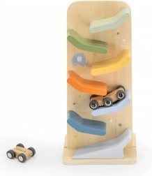 Den farverige rampebane med bil motiverer til gentagen leg, styrker iagttagelse, koordination og forståelse af årsag og virkning.