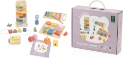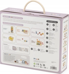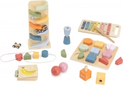 Opdag et komplet sæt trælegetøj til de mindste, der udvikler finmotorik, hånd‑øje‑koordination, genkendelse af farver og former samt den første musikalske sans. Den praktiske transportboks med hank holder alt samlet og er ideel både hjemme og på farten.