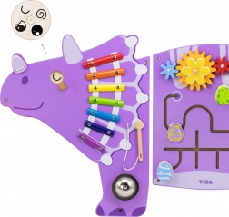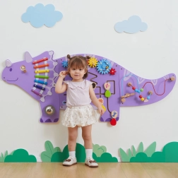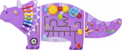 Farverig sansevægsplade i træ formet som en triceratops fra VIGA TOYS, der tilbyder masser af aktiviteter til børns udvikling. Her finder du en xylofon med kølle og en klokke/gong, roterende tandhjul, en labyrint med 5 åbningsbare æg (spejl + små dinosaurer), skiftende øjne via en knap og en fængende perlesnor-motorikbane med perleafskyder. Suveræn til finmotorik, øje–hånd-koordination og sanselig udforskning.