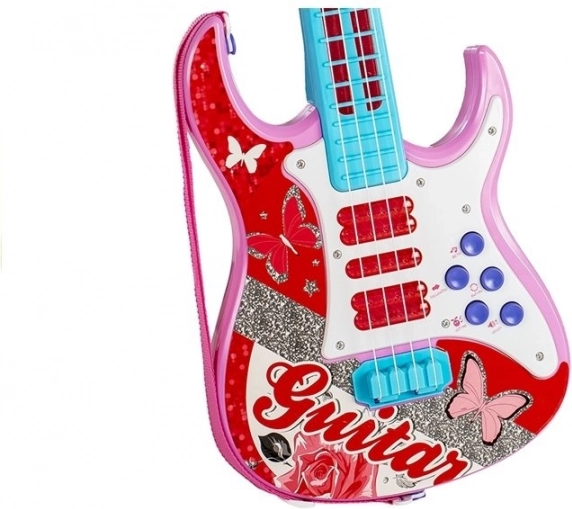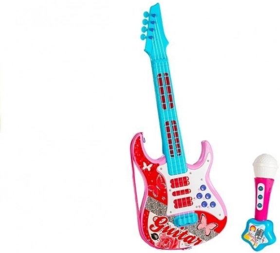 Musiksættet til børn indeholder en guitar og mikrofon i livlige farver med smukke motiver af sommerfugle og roser. Guitarens blå strenge, knapper til musikeffekter og funktioner gør det nemt at skabe lyde. Hold blot knappen nede for at aktivere melodi- og lysfunktion. Mikrofonen med holografiske detaljer og let greb giver ethvert show et professionelt præg.