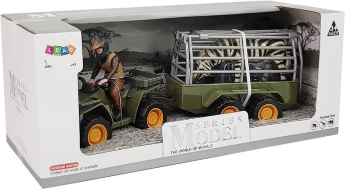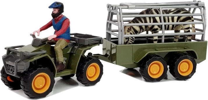Opdag et sjovt sæt til små eventyrere: en grøn ATV med aftagelig trailer og åbbar bagklap, dertil en realistisk zebrafigur og en chauffør med hjelm. Sikkert materiale, let konstruktion og CE-, EN 71-certificering gør dette legetøj til et godt valg for børn fra 3 år.