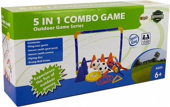 Sjovt børnesæt med sportslege 5 i 1 til udendørs leg: fodboldmål, FRISBEE, ringspil, fangekurve og træningskegler. Holdbar plast, hurtig montering og udvikling af koordination og reflekser. Ideelt til børn fra 6 år med CE- og EN 71-certificering.