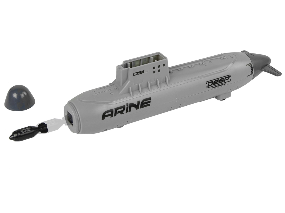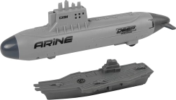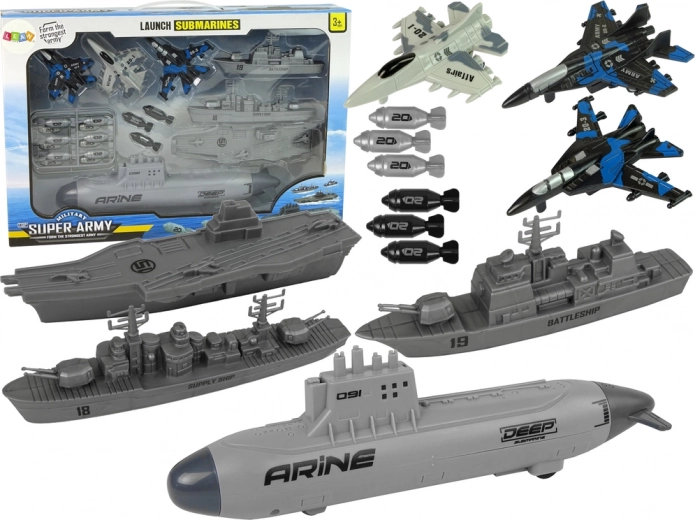 Højdepunktet er en ubåd med mekanisk affyringsmekanisme og hjul for glidende bevægelse på gulvet. Indsæt projektil ovenfra, træk bagenden tilbage og affyr – de sikre plast“bomber” giver et action-præg i legen. Flåden suppleres af krigsskib, forsyningsskib og hangarskib, mens tre jagerfly leverer luftstøtte til hver mission.