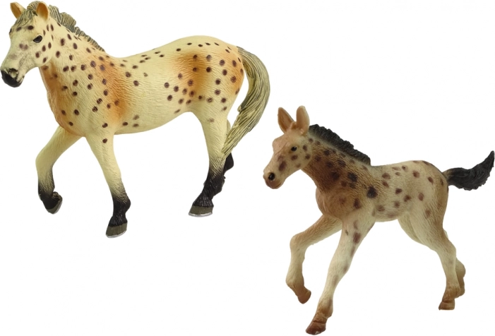 Voksen hest og føl med plettet farvetegning, håndmalede detaljer og troværdigt udseende imponerer ved første øjekast.