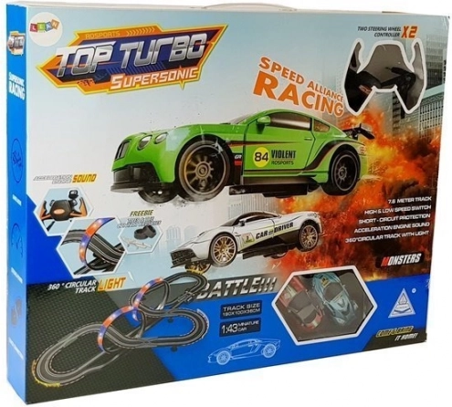 En realistisk racerbane i skala 1:43 med to biler bringer hastighed, adrenalin og fair konkurrence. Banen er 7,6 m lang og byder på fængende loops med 360° rotation, farverige LED-effekter og controllere med hastighedsregulering samt lydeffekter. Ideel til fælles leg for to racere.