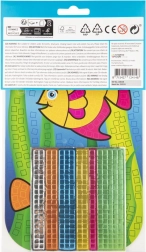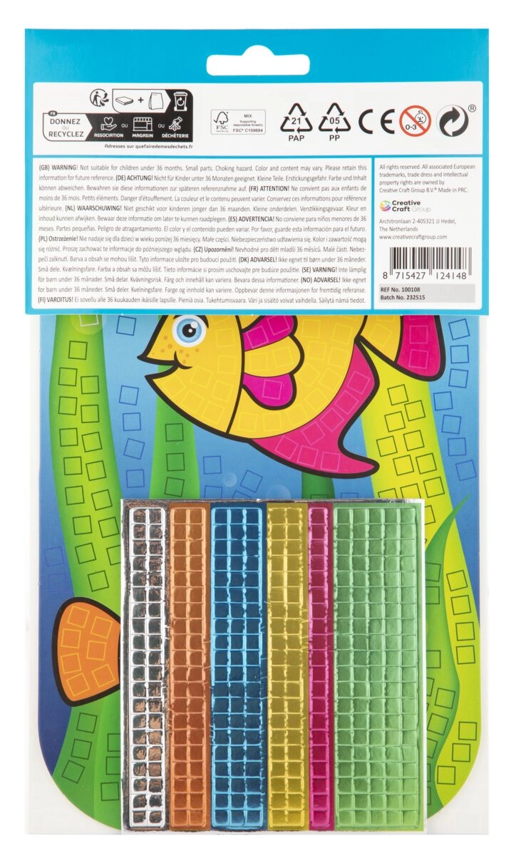 Et sjovt og kreativt sæt til børn, der gør det muligt at lave en smuk metallisk mosaik med fiskemotiv. Brug de farvede selvklæbende skumfirkanter og sæt dem på skabelonen efter de angivne farver for at skabe et iøjnefaldende billede.