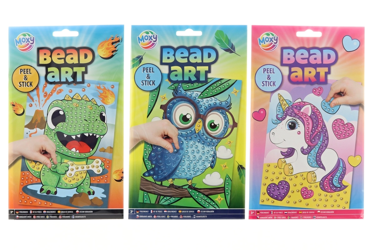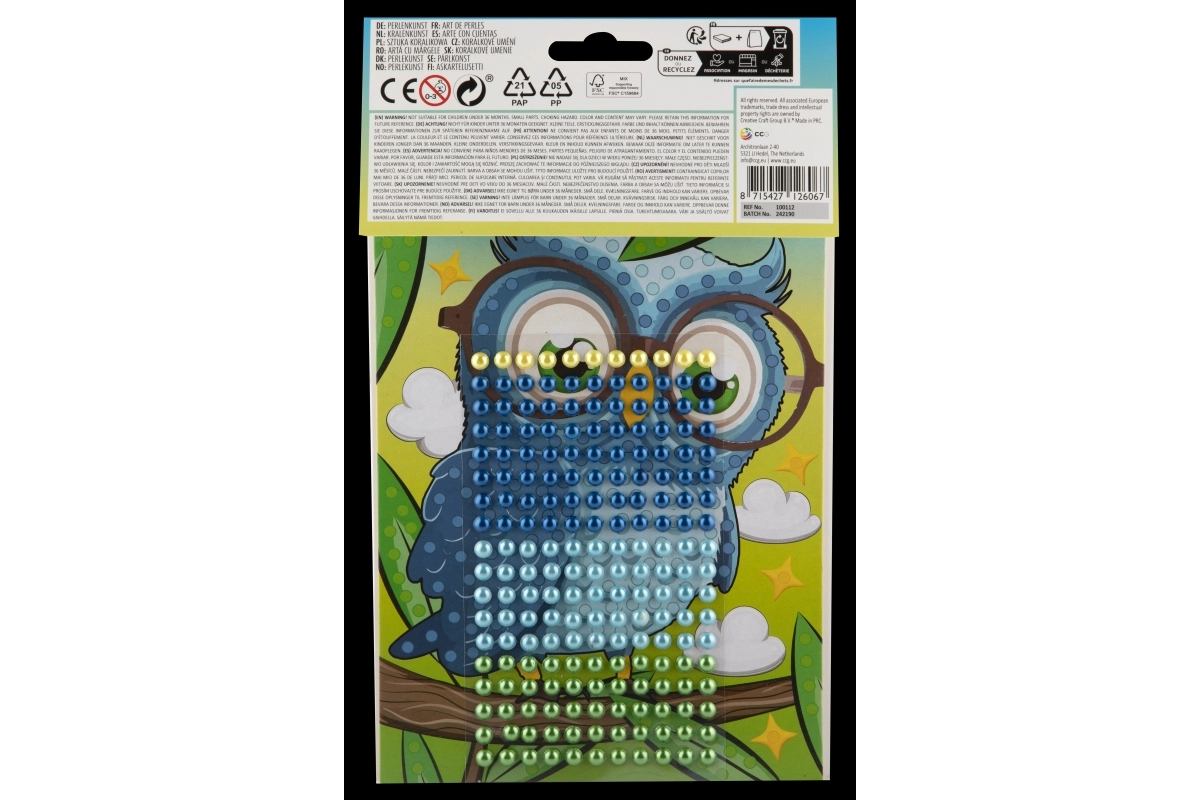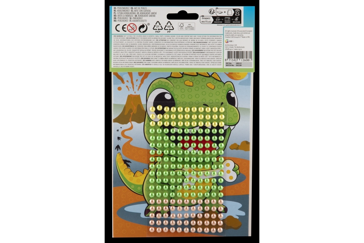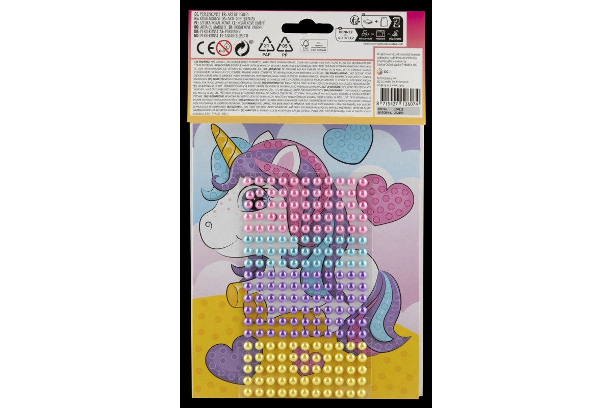 Pakkens indhold: kartonunderlag med dyremotiv og et sæt selvklæbende perler. Anbefales til børn fra 3 år under opsyn af en voksen.