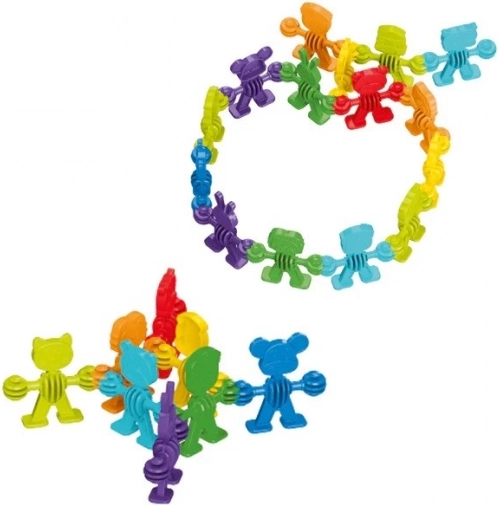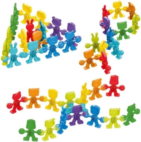 Figurerne kan kobles sammen, så børn kan lave cirkler, kæder og simple konstruktioner – en sjov måde at udvikle motorik og kreativitet på.