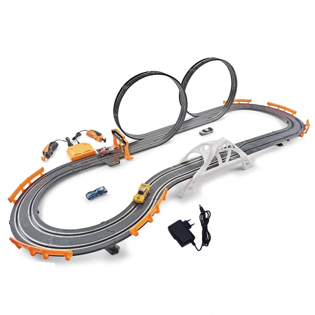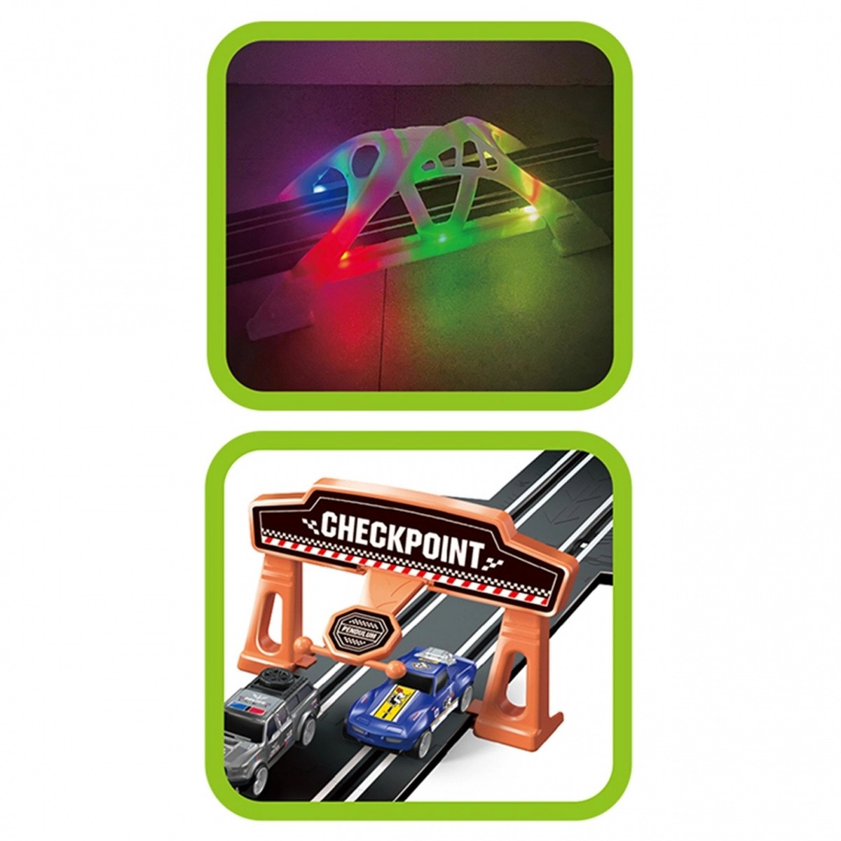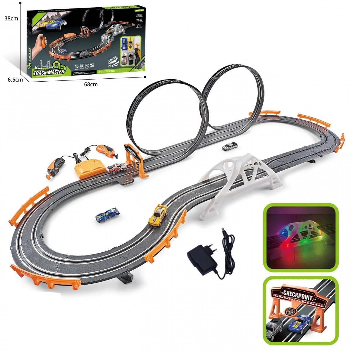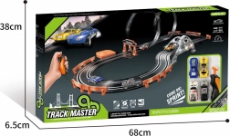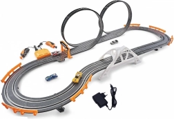 Oplev den fantastiske racerbane, der måler i alt 520 cm og giver dynamisk og spændende underholdning for enhver spiller. Sættet indeholder to biler med mulighed for at skifte karrosseri, så du kan tilpasse bilernes udseende efter egen smag.