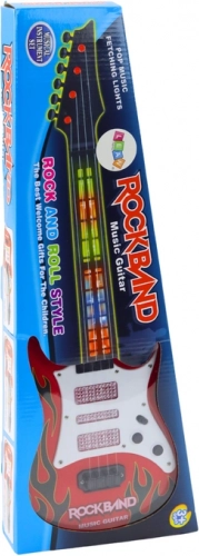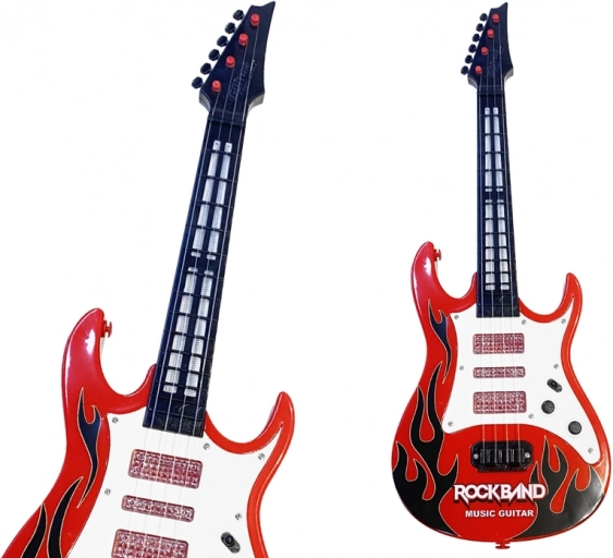 Elektrisk børneguitar med lys og melodier i rød farve. Ideel til små musikere, tilbyder lyseffekter, forudindstillede melodier og en komfortabel skulderrem. Udvikler kreativitet og musikalske færdigheder. Til børn fra 3 år.